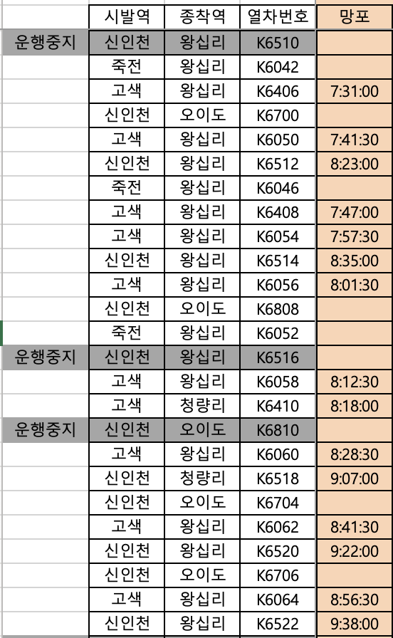 망포역 기준으로 출근 시간대 시간표입니다.
