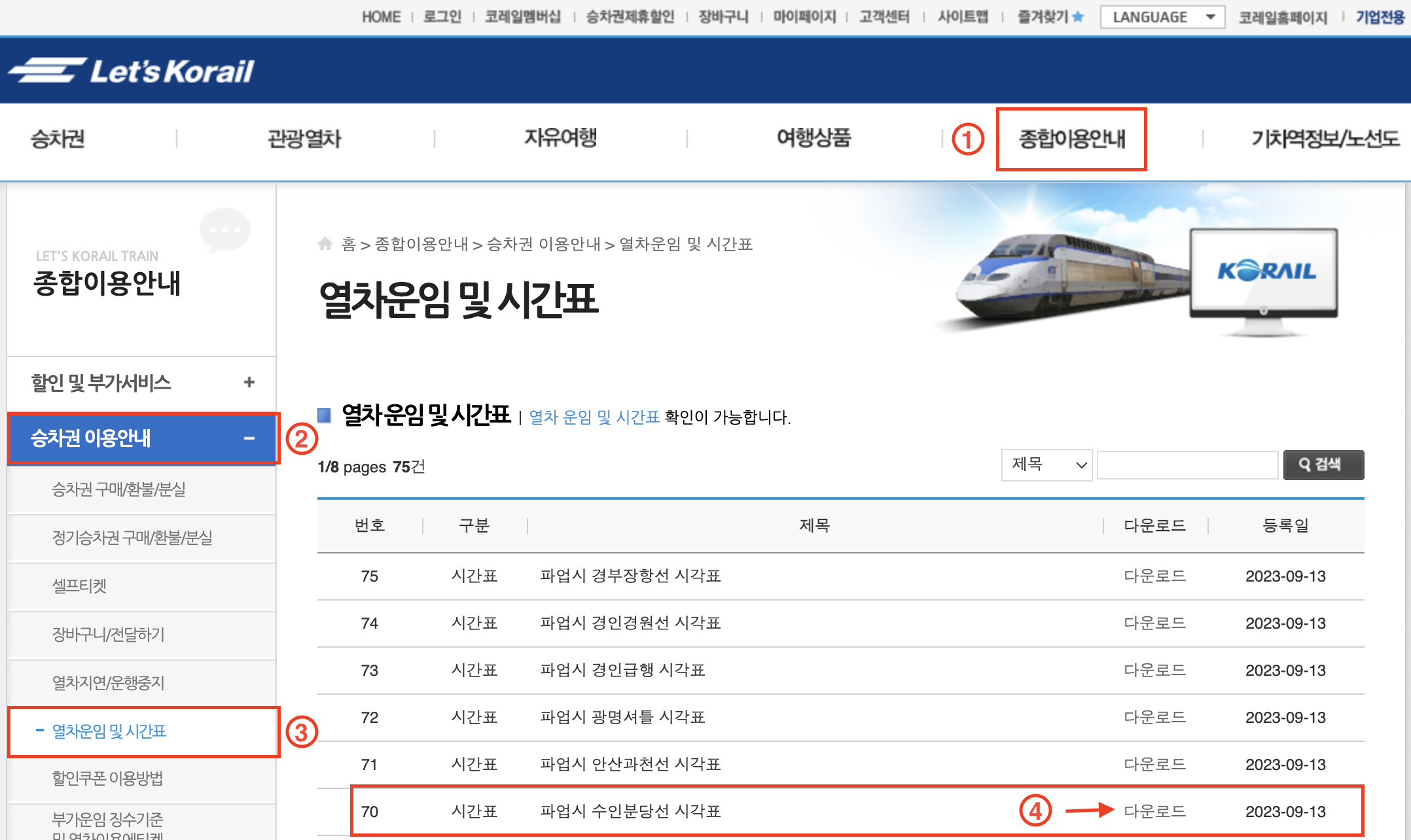코레일 홈페이지에서 시간표를 다운로드 받을 수 있습니다.