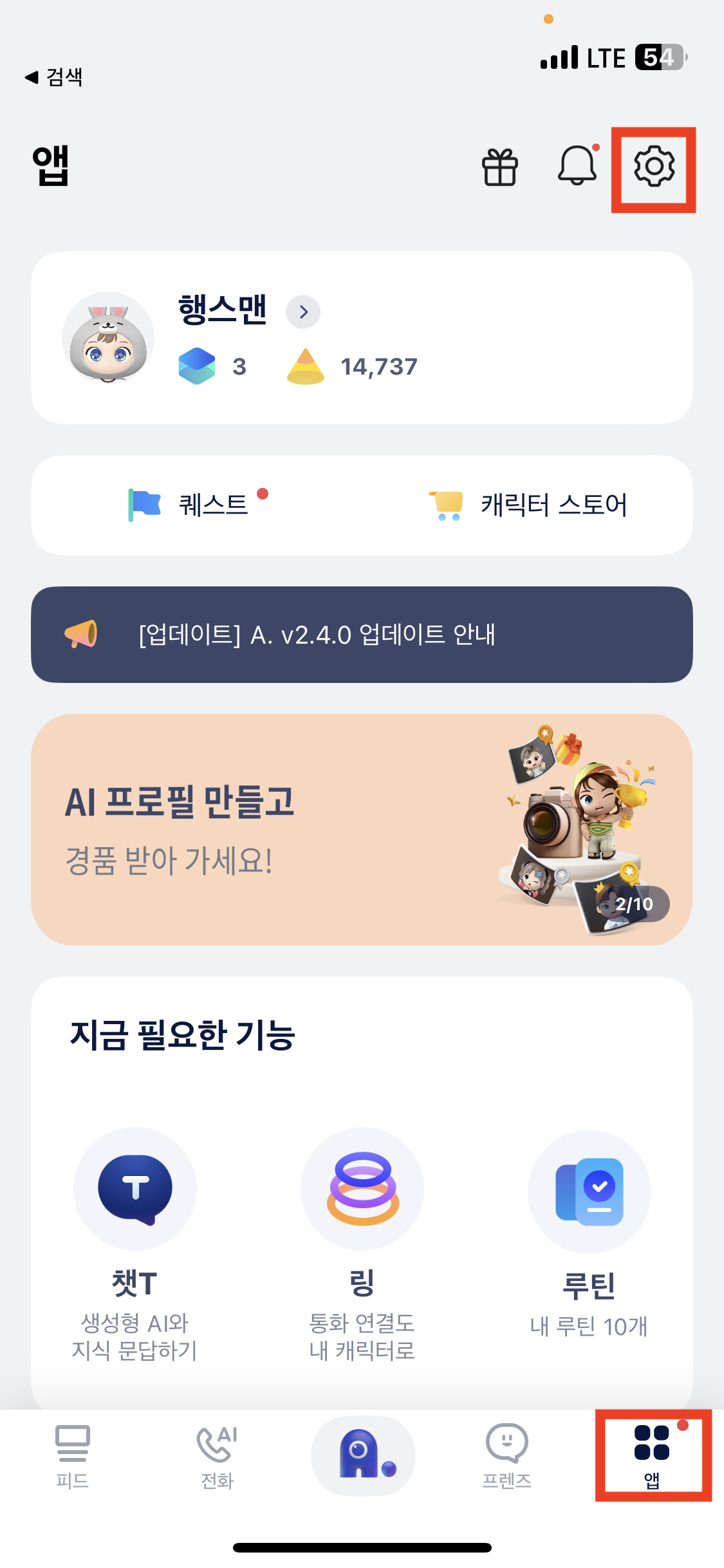 1. 에이닷 앱 우측 하단 "앱" 탭 클릭 & 우측 상단 설정 아이콘 클릭