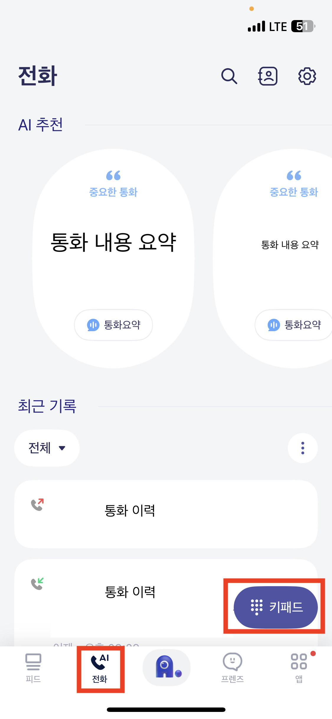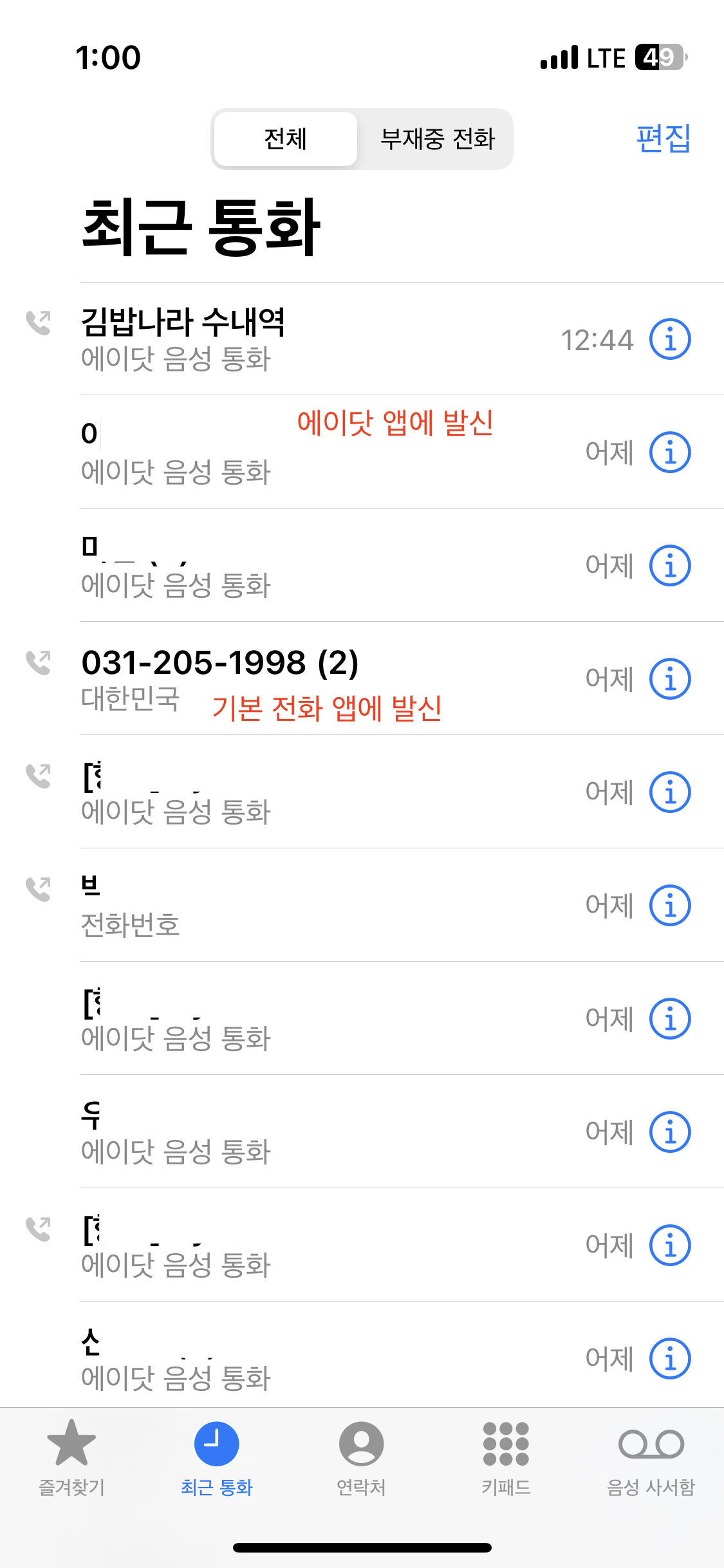 4. 기본 전화 앱의 최근 통화 목록에서 에이닷으로 통화 한 내역과 기본 통화 앱으로 발신한 내역을 확인 할 수 있다.