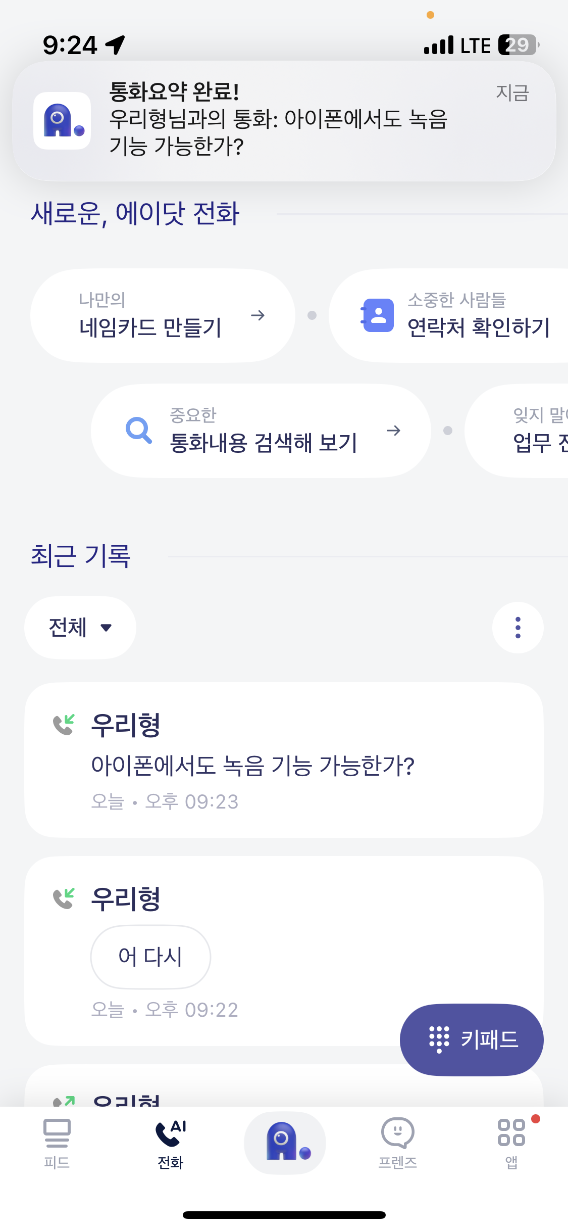 - 전화 종료 후 대화 내용을 요약해주며 통화 내용을 텍스트로 확인할 수 있습니다.
