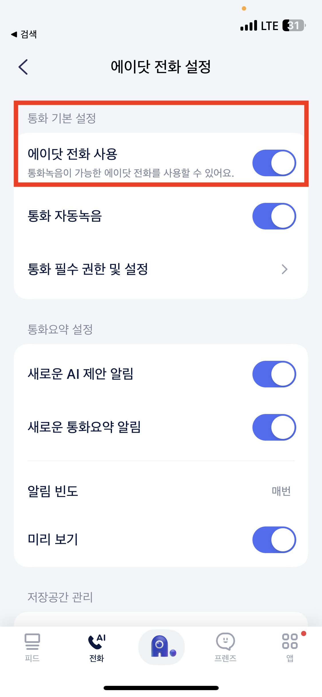 2. 에이닷 전화 설정 화면에서 에이닷 전화 사용 활성화